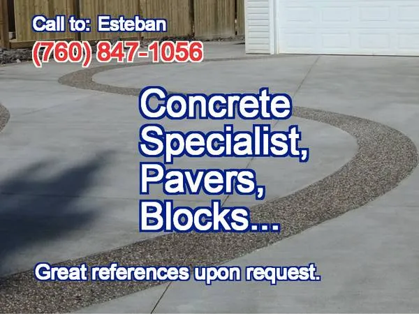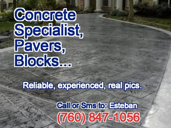 ✅EC PRO Concrete Specialist, Pavers, Blocks, more. Reliable✅ Concrete Specialist: Driveways, patios, sidewalks, walkways. Foundations. Concrete removal and replace. Retaining walls. Steps and stairs. Concrete color, stamped, bands. Steps and stairs. Concrete demolition and hauling. Regular Concrete. St 1 works. Decorative concrete. Planters. Fireplace. BBQ. Cement... Pavers and St 1 s: I do install all kind pavers, driveways, patios, walkways, sideways. Hardscape for landscape. Excavation, grading, leveling... I do install all kind decorative st 1 s... Bricks, Blocks, Masonry: Masonry services. I do block walls, brick walls. Flagst 1 s... More Services: Demolition, drainage, windows and doors install, more... Local owned. Great References. Reliable. Free, quick, fair estimates. Real pics. No email. 📱 Call, sms or text E. Carrillo: 760-847-1056 anytime, 24/7. Work areas: North San Diego, San Diego City, San Diego County cities. Keywords: hardscape, stamped, colored, demolition, steps, stairs, bbq, fireplace, design, exposed, aggregated, cement, concretero, landscaping, hardscaping, landscape, construction… quote, estimates, experienced, affordable, discount, veterans, seniors, eco-friendly, pet friendly, h 1 st, venmo, zelle, paypal, customized, dependable, residential, commercial, locally owned, emergency, pictures, free, on-site, sms, text, jobs, works.