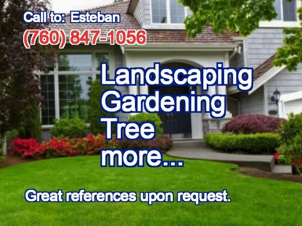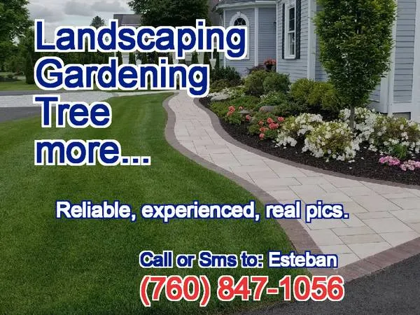 ✅ESTEBANs Landscaping, Gardening, Tree, more. Reliable. ✅ Landscaping: Repair and install sprinklers system. Resod, sodding, new lawn. Retaining walls. Bark, gravel, mulching. Repair and install new fences. Drip system. Timer, valves... Gardening: Complete garden care. Yard and slope cleanup. Ivy topping. Planting. Weed control. Ground cover. Weeding, mowing, trimming, blowing. Maintenance service. Weekly, biweekly, once month. Green hauling. Residential, commercial... Tree Service: Tree, palm, stump removal and trimming. Palm shaving, pruning, topping... Reliable. References. Real pics. Free, quick, fair estimate. 📱 Call or text Esteban C.:760-847-1056 anytime, 24/7. Work areas: North San Diego cities. San Diego metro. Keywords: Landscaper, gardener, planter, french drainage, design, sod, sodding, resodding, brush, flagst 1, pebbles, hillside, seed, seeding, hardscape, español, masonry, edging, drip, bark, woodchips… quote, estimates, experienced, affordable, discount, veterans, seniors, eco-friendly, pet friendly, h 1 st, venmo, zelle, paypal, customized, dependable, residential, commercial, locally owned, emergency, pictures, free, on -site, sms, text.