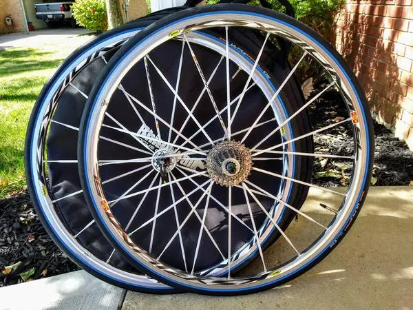 Please call or text me at 513-226-6171you will be glad you did! MSRP: $1300 Very Very Low Miles as the brake tracks attest to--Smooth, True, and oh So Fast!! * $440--Stripped--Rims only ** $540--Dressed and Ready to Roll--Matching QR Skewers, Continental Ultra Sport TiresBlue Line, Shimano 9 or 10 Spd Cassette * 2012/13 Ksyrium SLSuper LightBasic Specs; 700 c 622 x 15 mm Accepts 8/9/10/11 speed Shimano/Sram cassette Stock Mavic QR Skewers Rear Spacing: 130 mm Front Spacing: 100 mm Spoke count: 18/20 H front/rear Recommended tire sizes: 19 to 32 mm W 8: 1480 g w/o skewers 645 g front, 840 g rear * Features; Extra-light comp 1 nts: FTS-L free-wheel, Zicral straight pull, bladed spokes, front Radial, rear Isopulse Light and stiff rims: ISM Less inertia: ISM Optimised energy transfer: Isopulse lacing and asymmetrical rim Rim resistance: Maxtal, SUP Fore drilling High quality adjustable cartridge bearings: QRM+