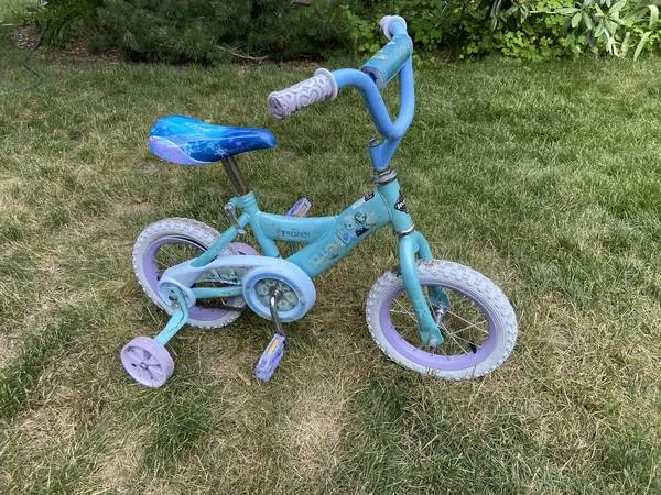 Huffy FROZEN girls bike with training wheels. Blue & turquoise color. Foot brake. 12 wheels.back wheel needs tube replacement. Cash or charge only. 269-455-9192 Delivery available for a nominal fee.
