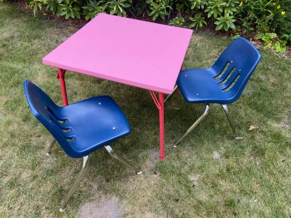 Kid Size folding table & 2 chairs. Wood top, steel frame/base. 25 x 25 x 20 high. Cash or charge only. 269-455-9192 Delivery available for a nominal fee.