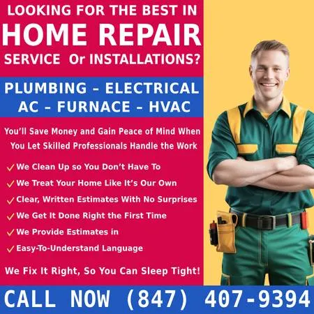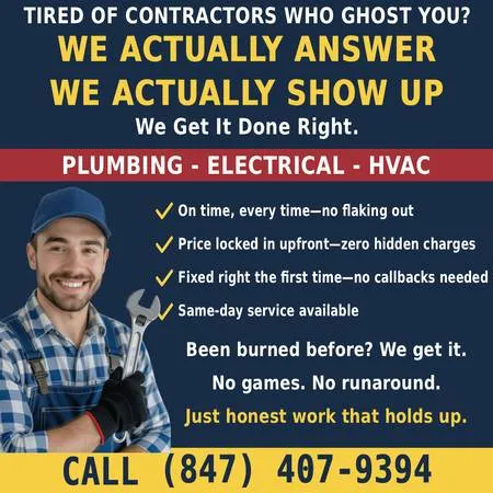 Exhausted from Contractors Who Dont Keep Their Word? Call - 847-407-9394 When your home has issues, you need some 1 who actually delivers. We answer calls, arrive when promised, and complete the job properly. No games, no disappearing. PLUMBING: • Water heater repair and replacement • Leaking faucets and fixtures • Toilet wont flush or runs constantly • Slow drains and backups • Garbage disposal stopped working • Pipe leaks and bursts ELECTRICAL: • Breaker keeps tripping • Dead outlets and switches • Light fixture replacement • Electrical panel issues • Ceiling fan wont work • Flickering lights FURNACE REPAIR: • Heater not blowing hot air • Air conditi 1 r wont cool • Thermostat problems • Furnace making weird sounds • Burning smell from vents HERES WHAT WE DO: → Pick up calls and respond fast - no more chasing us down → Arrive on schedule or notify you early - we respect your day → Quote the real price upfront - no shocking bills at the end → Come fully equipped to work - ready to complete it today → Fix it properly not halfway - work that stands the test → Clean up thoroughly after ourselves - leave your space spotless → Take pride in what we deliver - our reputation rides on it You shouldnt have to settle for flaky service. We show up, do the work right, and stand behind it. Small problems snowball into expensive disasters quickly. Dont let it spiral - call today and lets get it fixed properly. Plumbing Plumbers Water Heater installation & Repair Bathtub Rooting Hydro Jetting Service Toilet Installation Garbage Disposal Installation / Repair Leak Detection Kitchen Sink Water filtration systems Copper Repipe and Repair Backflow prevention Water Heater repair or replacement Gas Leak Detecting and Repaired Toilet & urinal repair or replacement Rooter services Drain Cleaning Appliance installations Sewage system Tankless Water Heater System Faucet Installation Hot Water Recirculation System Toilet Repair/Install Bathroom Sink Rooting Water Line Service Master plumber at affordable price Water Heater Installation Kitchen faucet repair or replacement Drain cleaning Installation of gas shut Drain Clogs Rooter Full Service Plumbing and Drain Repairs Water pipes Toilet Replace and Repair Low flow toilets Garbage Disposal Installation Faucet pressure Leaky Faucet Pipe Installation Backflow / anti Regulator Plummer Hot Water Recirculation System Sewer Lines Installed and Repaired Water Heater installation & Repair Drain Cleaning and Unclogging Rooter services Electrician Accent Lighting Trouble Shooting and Expert Repairs Lighting Accessories Surge Protection Dimmers Service Upgrades/Repairs Under Cabinet Lighting Ceiling Fans, New installs Overloaded circuits Electrical Services and Electrical Service Upgrades Tripped breaker/blown fuse Appliances / Water Heaters New Homes/Additions/Remodel Experts Lighting Installation Dryers / Ranges / Microwaves Ceiling And Attic Fans Electric heater Custom Lighting Design Security Lighting Doorbells Mini Chandeliers Under the counter lights, accent lights Electricians Pool & Spa Wiring Recessed Can Lighting Trouble Shooting Electrical Carbon Monoxide GFCI Protection Low Voltage Wiring Lighting, Recessed Lights installed Solar Panel Installation Master Electrician Fan Installation Indoor And Outdoor Lighting Electrical Roof and Gutter De-Icing Cable Lighting For Fixtures Remodels New and Old home repair specialists Branch circuit faults Semi Flush Mounts Island Lighting Fuses and Circuit Breakers HVAC Wiring Motion Sensor Lights Emergency Electrical Services Fluorescent Lighting New Construction Lighting Mini Pendants Electrical Contractor Smoke And C 02 Detectors Room Additions Landscape Accent Lighting Design Electrican Lighting Installation Code Corrections Receptacles, switches, GFCI Solar panels Emergency Generators Hot Tub Or Jacuzzi Wiring Outdoor Lighting Ceiling fans and exhaust fans attic fans Electrical Safety Analysis Billiard Lighting Computer Circuits Hot Tubs / Jacuzzi Tubs Track Lighting Ceiling Fans/Exhaust Fans/Attic Fans Lighting For Fixtures Security Lights, Motion sensors Chandeliers, Scants, Dimmers, Spotlights Code correction/Code Compliance Repairs Storm Damage Service Equipment Repair Dusk To Dawn Lighting Generator Installation Switch And Outlet Repair Interior Lighting Chandeliers Electrician phone and cable TV ARC Fault Protection Flush Mounts Electrical Work Underground wiring Underground Services Electrical Work Roofing Reroofing Roof Inspection Metal Roof Roof Repair Roofing Contractors Roof Replacement Roofing Shingles Flat Roofs Gutter Cleaning Windows Window Installation Siding Repair Home Roofing Roofer Asphalt Roofing Siding Gutters Roofing Services Storm Damage Roofers Industrial Roofing Certified Roofing Roofing Service Gutter Installation Seamless Gutters Re Roof Asphalt Roll Roofing Roofing contractor Window Repair Gutter Install Wood decks Wood fences Exterior Window Replacement Shingle Metal Roofing Hail Damage Local Roofing Company Wood Roof Coating Emergency Roof Tarping Leak Detection Skylight Installation Attic Ventilation Painting Interior Painting Exterior painter Residential Painting Contractors House Painting Companies Painting contractors Exterior Painting Companies Cabinet Painting Contractor House Painter Interior Wall Painting Outside House Painting Painting - Faux Finishes Interior Home Painting Paint Trim Exterior House Painting Interior painter House Painting Services Paint Removal Exterior painting Residential Painters Paint Stripping Painting Services Exterior Painting Service Home painting Painting House painting Home Painting Services Interior Painters Outside House Painters Painters Home Painters Interior Painting Interior House Painters Exterior House Painters Interior Painting House painters HVAC Boilers Gas Heaters Furnace repair HVAC Systems Air Condition Installation Electric furnace replacement Boiler Heating Air Conditi 1 r Repair Installer HV