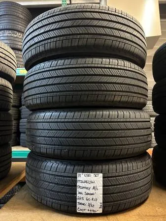720-551-6907 This listing is for a set of 4 Tires This set is priced at: $450 Installation is available. Michelin Primacy A/S All Season tires Size: 225/60 R 18, 225/60/18, 22560 R 18 Tread depth: 8/32 DOT: 3123