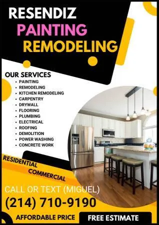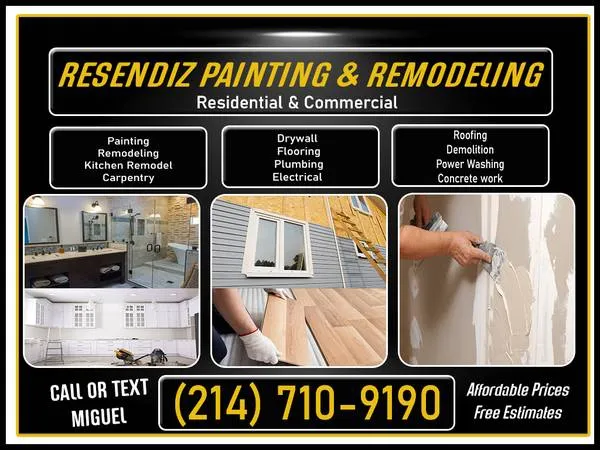 ✅ Resendiz Painting & Remodeling ✅ Residential & Commercial ✅ Call or TextMiguel📞 214-710-9190 ✅ Free Estimates - Affordable Prices ✅ We service Entire DFW Metroplex ✅ Family Owned & Family Operated ✅ Call or TextMiguel📞 214-710-9190 🔴 SOME OF OUR SERVICES: 🔴 INTERIOR 🔴 EXTERIOR 🔴 PAINTING 🔴 DRYWALL 🔴 TEXTURE 🔴 FLOORING 🔴 WALLS 🔴 BACK SPLASH 🔴 REMODELING 🔴 KITCHEN REMODEL 🔴 BATHROOM REMODELING 🔴 HOME REMODEL 🔴 HOME REPAIR 🔴 CARPENTRY 🔴 ROOFING 🔴 PLUMBING 🔴 FENCE 🔴 SIDING 🔴 WINDOWS 🔴 RENOVATIONS 🔴 FRAMING 🔴 AND MUCH MORE Call or TextMiguel📞 214-710-9190 Call or TextMiguel📞 214-710-9190 Call or TextMiguel📞 214-710-9190 Resendiz Painting & Remodeling Resendizpaintingandremodeling.com _________________________________________________________________________________________________ _________________________________________________________________________________________________ _________________________________________________________________________________________________ _________________________________________________________________________________________________ _________________________________________________________________________________________________ _________________________________________________________________________________________________ _________________________________________________________________________________________________ _________________________________________________________________________________________________ _________________________________________________________________________________________________ _________________________________________________________________________________________________ _________________________________________________________________________________________________ _________________________________________________________________________________________________ _________________________________________________________________________________________________ _________________________________________________________________________________________________ _________________________________________________________________________________________________ _________________________________________________________________________________________________ _________________________________________________________________________________________________ _________________________________________________________________________________________________ _________________________________________________________________________________________________ _________________________________________________________________________________________________ _________________________________________________________________________________________________ _________________________________________________________________________________________________ _________________________________________________________________________________________________ _________________________________________________________________________________________________ Dallas Plano Irving Fort Worth Richardson Addison Frisco Arlington Carrollton Southlake Lewisville Garland Mckinney Allen Coppell Denton Grapevine Grand Prairie Flower Mound Mesquite Bedford Rockwall Sunnyvale Hurst North Richland Hills Sachse Little Elm Keller Lancaster Burleson The Colony Cedar Hill Euless Wylie Colleyville Red Oak Prosper Weatherford Mansfield Farmers Branch Greenville Alvarado Aubrey Cleburne Waxahachie Farmersville Terrell Justin Duncanville Argyle Wilmer Anna Keene Italy Haltom City Roanoke Commerce Crowley Granbury Rainbow Tolar Krum Wolfe City Campbell Palmer Lipan Poolville Princeton Springtown Paluxy Aledo Melissa Crandall Millsap Alvord Scurry Rosser Glen Rose L 1 Oak Slidell Kennedale Forney Mabank Midlothian Lillian Sanger Haslet Azle Grandview Pilot Point Rowlett Kaufman Bridgeport Ennis Lake Dallas Decatur Seagoville Ponder Caddo Mills Godley Maypearl Dennis Josephine Naval Air Station/ Jrb Boyd Greenwood Avalon Westminster Ferris Paradise Nemo Whitt Elmo Joshua Royse City Quinlan Milford Merit Rhome Bardwell Weston Venus Rio Vista Celeste Copeville Kemp Celina Nevada Hutchins Cresson Trophy Club Peaster Newark Forreston Fate Lavon Blue Ridge Chico Desoto Services: Painting House Painter Exterior Painting Interior Painting Drywall Installation Drywall Repair Carpentry Decks Door Installation Door Repair Fence Fixing Fencing Fences Fence repair Gutter Cleaning Gutter Repair Handy man Siding Vinyl Siding Window Repair Window Replacement Window Installation Windows Room Additions Home Repairs Remodeling Painters Window & Repair House painting House painters Home painting Painting contractors Interior painter Exterior painter Bathroom remodeling Kitchen remodeling Kitchen Remodeler Sun Rooms Renovations Carpenter Wood working Cabinet Painting Shingles Interior House Painters Interior Wall Painting Exterior House Painters Professional Painters Home Painting Services Home Painters House Painting Services Residential Painters Professional Painter Interior Home Painting Residential Painting Contractors House Painting Companies Exterior Painting Service Exterior Painting Companies Outside House Painters Outside House Painting Painting - Faux Finishes Paint Removal Paint Stripping Paint Trim Cabinet Painting Contractor Exterior Painting Interior Painting Interior Painters Painting Services Vinyl plank We service Dallas and its surrounding neighborhoods: Dallas, DALLAS, Bent Tree, Bluffview, Casa Linda, CENTRAL DALLAS, Deep Ellum - Expo Park, Design District, Devonshire, Downtown, EAST DALLAS, Eas 2 od, FAR NORTH DALLAS, Forest Hills, Greenway Parks, Highland Park, Hillside, Hollywood H 8 s - Santa Monica, Kies 2 od, Lake Highlands, Lake Park Estates, Lakewood, Lakewood H 8 s, Little Forest Hills, Lochwood, Love Field, Lower Greenville, M Streets - Vickery Place, Medical District, Midway 