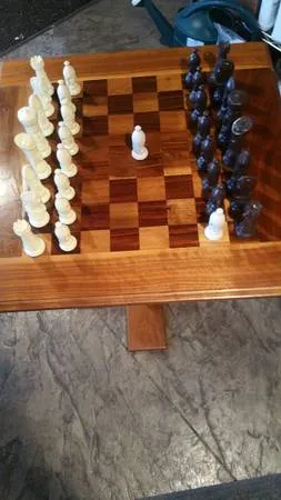 Vintage wooden Chess Table and ceramic chess pieces in good to excellent condition. The table is 271/2 T, Top is 221/2 x 23. The king is 4 and the queen 31/4 as a reference the pawns are 3 T. 1 pawn requires paint. Please, cash or Postal M 1 y Orders only. Pick-Up only Please, serious inquiries only. Contact Patsy at 816-865-1783. Thanks for your interest. I DO NOT DELIVER.