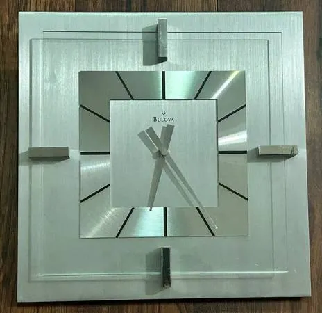 Bulova Stainless And Glass Modern Style Wall Clock. The clock is 12 x 12 square. The clock is in perfect condition. Im asking $30 for the clock. Please call or text Erin if interested at 720-334-4827