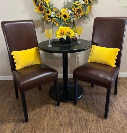 Black Table Wood with metal base 30 x 29 and 2 NEW Brown faux leather Dining Chairs, Great for an apartment or small space $150 Cash only call or text 775-378-8162 Located in Sparks Boulevard/Baring