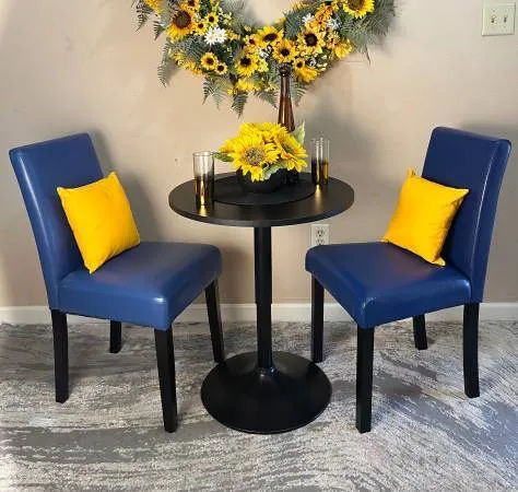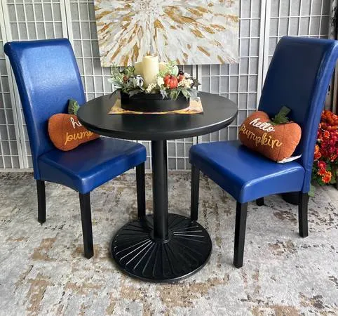 Black Table Wood with metal base 30 x 29 and 2 NEW Blue faux leather Dining Chairs, Great for an apartment or small space $150 Cash only call or text 775-378-8162 Located in Sparks Boulevard/Baring