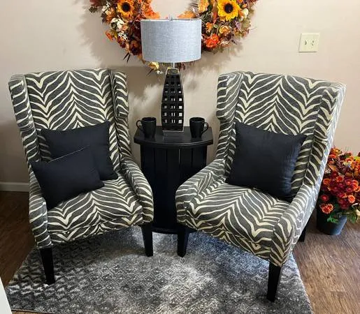 Really Nice Pair of Zebra print Wingback Chairs 27 x 27 x 43 in like new condition only used for staging $200 Cash only Call or text 775-378-8162 located Sparks Blvd/Baring Black Cabinet add $25 Lamp add $25