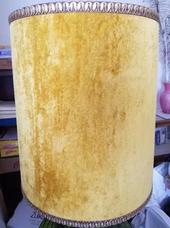 1960 S - 1970 S EMERALD GREEN LAMP WITH GOLD VELVET SHADE 38 TALL FROM BASE TO TOP OF SHADE. LAMP IS 48 ROUND. CLEAR EMERALD GREEN GLASS. LAMP HAS A 14 METAL FILIGREE TUBE INSIDE THAT HAS A LIGHT INSIDE THE TUBE THAT TURNS ON FIRST BY ITSELF THEN THE MAIN LIGHT CAN BE TURNED ON ALSO. BASE IS BLACK METAL AS WELL AS AT THE TOP OF THE LAMP AS SEEN IN PICTURE. A DRAPE OF GARLAND WITH TEA ROSES GO AROUND THE 48 MIDDLE OF LAMP. 405-413-8671