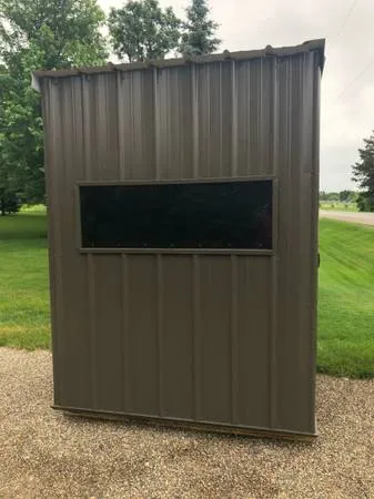 Amish built deer blind. Maintenance free slate colored steel. Tinted polycarbonate windows with foam gasket for soundproofing. Locking door with key, rodent guard, R-6 insulation. Measures 5 X 56. REGULAR PRICE Blind only = $1395.00 Also available 6 base with platform, stair and rail. REG PRICE $595.00 FREE delivery within 50 miles Call: 320-252-4626