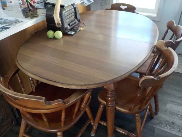 Very sturdy farm ,ranch style wood table and 4 chairs and 21 foot extension leaves. Only ever in 1 house,1 room . Wool coasters on bottoms all legs. 3 foot 6 inch wide and 4 foot 6 inch long[add 1 foot each for extensions which have never been used.6 foot 6 inch. very heavy pick up near paynesville,spicer new london. 320-354-0211 [landline.] calls only no answer machine
