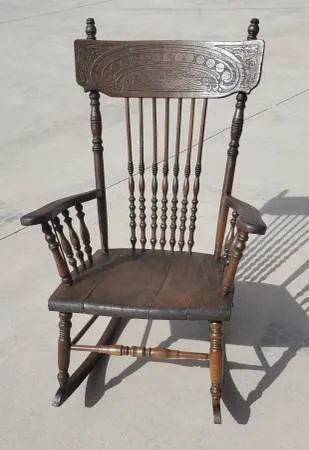 This antique rocking chair has been totally restored to its original finish and parts have been re-glued so is as sturdy as the day it was made. I believe it is from the late 1800 s to early 1900 s era. It is unique with the pressed back and the decorative wooden dowels in the back and the 1 s on the sides holding up the arms. The rocker seat is 20.5 wide and is 18 high. The back is 40 high. It is very comfortable and rocks smoothly. There are a number of cracks in the seat due to age but they do not effect the sturdiness of the rocker. Because of the age and the condition it is a great buy and could be used in almost any room in your home. If interested please call Sharon at 719-488-3778 which is a land line number so wont accept texts. I will delete this ad as soon as it is sold. Check out my other listings on the more ads by this user box. Cash Only! Thanks for looking!