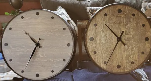 These clocks are made with old wine barrel lids and come in different colors. 2 are stained with dark walnut, 1 has a grey wash, 1 has a white wash. The hands and works are brand new and differ in style and size. They measure 22 in diameter. We can make a clock customized if you want a different look. If interested please call Sharon at 719-488-3778 which is a land line number so wont accept texts. I will delete this ad as soon as it is sold. Check out my other listings on the more ads by this user box. Cash Only! Thanks for looking!