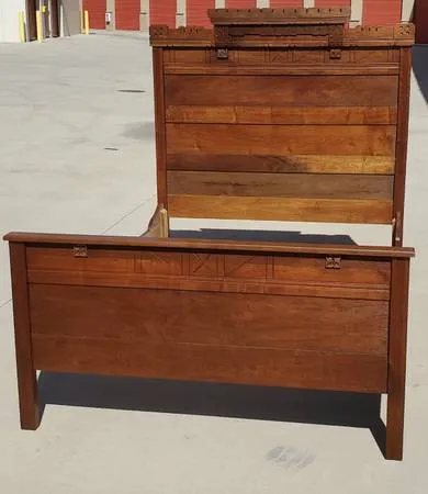 This walnut headboard, footboard and wood side rails have all been refinished and is now ready for a new home. The headboard some nice carving and extra decorative wood pieces that are attached with screws and can be removed. It has an European feel to it. The footboard also has some carved designs that match the headboard. The measurements on the headboard is 57 wide and 64 high. The footboard is 57 wide by 31 high. This bed is for a double mattress and box springs. If interested call Sharon at the number listed in the reply box.719-488-3778. This is a land line so will not accept texts. I do not respond to emails or texts and will delete this ad as soon as it is sold. Check out my other postings by clicking on the more ads by this user box on the right side of the ad under the map. Cash Only Please! Thanks for looking!