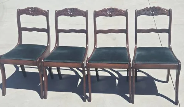 This is a beautiful set of Duncan Phype style dining room chairs that have all been restored and re-glued and are now ready for a new home. The seats have a nice velvet dark green fabric on them. The backs have a rose carved on the top rung which was commonly d 1 during that era by some of the high end furniture companies. If you are interested in the set please call Sharon at 719-488-3778. This is a land line so will not accept texts. I dont respond to emails so please call me. Check out my other listings by clicking on the box below the map which says more ads by this seller. Cash only please. Thanks for looking!