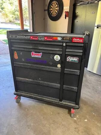 Great garage toolbox 6 deep drawers for larger tools and 2 shallow drawers Easy transportation, as it’s on for high grade wheels with brakes Workbench on top Measurements are in the pictures If interested, please contact me at 719-329-4584