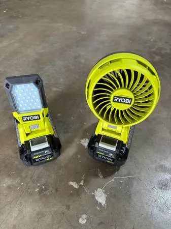 Ryobi 40 v lithium ion battery toppers 140 volt LED light with USB-C charging 140 v 3 phase fan with USB-C chargingsold Both connect to 2 by 4 s and have a hanging capability for camping and easy use 25 ah batteries for extended run time They both pack up to save space and are still very powerful If interested, please contact me at 719-329-4584