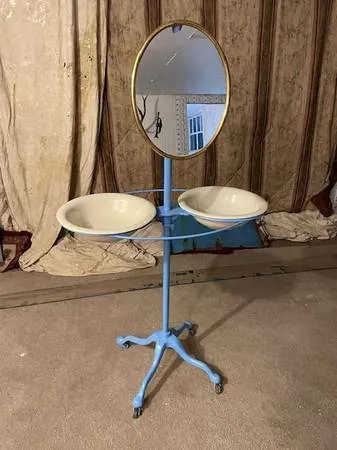 Antique wash basin on wooden wheels with mirror labeled 5 th avenue New York, 1950 s $150.00 excellent condition. 505-319-9358