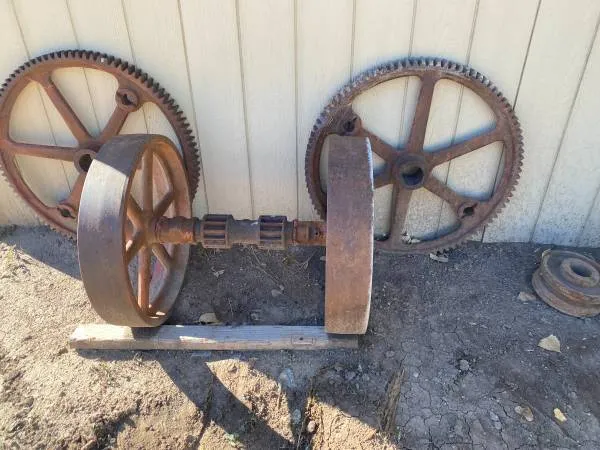 For sale: Large antique steel gear wheels, very heavy, larger gears are 33 inches in dimeter, the fixed set is 26 inches in dimeter x 33 inches long, 505-319-9358