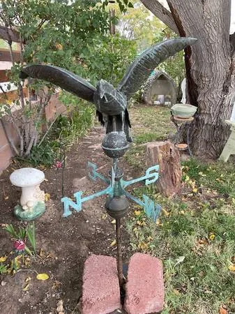 Beautiful Weathervane from Pacific Northwest over 100 years old with beautiful patina. Taken off old home in Wenatchee WA. Eagle and ball figures are copper. 3 feet tall and 30 inches wide. $900.00 - 505-319-9358