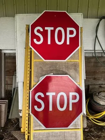 I HAVE FOR SALE 130 X 30 BRAND NEW,NEVER INSTALLED STOP SIGN FOR SALE.THEY ARE ALUM W/ENGINEER-GRADE PRISMATIC REFLECTIVE, PRE-DRILLEDk MOUNTING HOLES.MEETS STATE AND COUNTY SPECS.THE PRICE IS $50.00 EACH THAT MAKES THEM A GREAT BUY AS THEY SELL FOR $160.00 EACH RETAIL.THEY ARE BRAND NEW AND LEFT OVER FROM SUBDIVISION PROJECT.CALL 816-668-3922 THANKS DAVE I ALSO HAVE 4 DEAD END RED REFLECTIVE SIGNS MOUNTED ON TALL HEAVY STEEL POSTS $200.00 MEETS COUNTY SPECS.