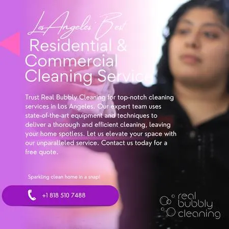 ✨ Sparkling Clean Homes, Happy Angelenos! ✨ 🏡😊 Located in the heart of Los Angeles ❤️, our family-owned business 👨👩👧👦 has been delivering top-notch cleaning services for over 20 years. Were dedicated to providing affordable and reliable cleaning solutions that transform your space from cluttered to clutter-free 🧹, leaving you with a sparkling clean home every time ✨. ✅ Our Comprehensive Cleaning Services: • Deep House Cleaning: 🛋️ We tackle every nook and cranny, from baseboards to ceiling fans, ensuring a thorough and refreshing clean. • Office Cleaning: 🏢 Create a productive and inviting workspace with our professional office cleaning services. • Post-Construction Cleaning: 🚧 Say goodbye to dust and debris! We provide meticulous post-construction cleaning for a pristine finish. • Move-In/Move-Out Cleaning: 📦 Enjoy a stress-free transition with our detailed move-in/move-out cleaning services. • Apartment Cleaning: 🏢 Tailored cleaning solutions for apartments of all sizes. • Green Cleaning: 🌿 We prioritize your health and the environment by using eco-friendly cleaning products. • Maid Service: 👩🍳 Regular cleaning services to maintain a consistently clean and tidy home. • Window Cleaning: 🪟 Let the sunshine in with our professional window cleaning services. • Carpet Cleaning: 🌀 We revitalize your carpets, removing dirt, stains, and allergens. • Upholstery Cleaning: ✨ Freshen up your furniture with our expert upholstery cleaning services. 🔹 Why Choose Us? • Experienced & Professional: Our team of skilled and trus 2 rthy cleaners has a proven track record of excellence 👍 • Locally Owned & Operated: Were proud to serve Los Angeles and its surrounding communities 📍 • Competitive Pricing: Exceptional cleaning services at prices that wont break the bank 💰 • Flexible Scheduling: We work around your busy schedule to find a cleaning time thats convenient for you. 📅 • Eco-Friendly Practices: We use safe and sustainable cleaning products that are gentle on your family and the planet 🌎 • Satisfaction Guaranteed: Your satisfaction is our top priority. We strive to exceed your expectations with every clean 💯 🔥 Winter Special: Enjoy a 10 discount on your first cleaning session! ❄️ This limited-time offer is the perfect opportunity to experience the difference of our professional cleaning services. ➡️ Check us out on TikTok! See our cleaning magic in action and get inspired with cleaning tips and tricks: https://www.tiktok.com/@realbubblycleaning 👈 Say goodbye to cleaning stress and hello to a pristine home! 👋 Contact 1 of our representatives For a free estimate and to schedule your cleaning session! 📅: Angela at 818-510-7488 📞 Joe at 818-679-3989 📞 . . . . . . . . . . Keywords: Los Angeles cleaning, professional cleaners, eco-friendly cleaning, home cleaning, affordable cleaning services, deep cleaning, office cleaning, post-construction cleanup, move-in cleaning, move-out cleaning, local cleaning service, experienced housekeepers, residential cleaning, commercial cleaning, flexible cleaning schedule, trusted cleaners, quality cleaning, satisfaction guaranteed cleaning, thorough cleaning, personalized cleaning service, apartment cleaning, green cleaning, maid service, window cleaning, carpet cleaning, upholstery cleaning