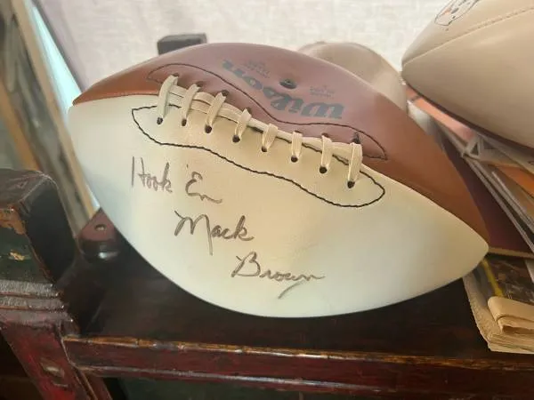Genuine hand signed Mac Brown football personalized Hook em horns 512-539-7892