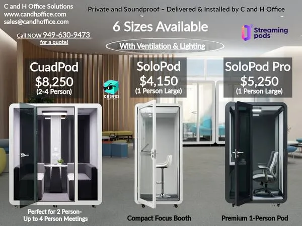 Private Office Pods by StreamingPods โ Delivered & Installed by C and H Office Bring privacy and focus back to your workspace with the SoloPod Pro โ our most popular model. Perfect for calls, video meetings, or heads-down creative work. Each pod includes ventilation, lighting, power, and full acoustic insulation โ professional quality for offices, studios, and home setups. Models & Pricing: SoloPod Pro โ $5,2501 Person Large / Premium SoloPod โ $4,1501 Person Large CuadPod โ $8,25024 Person Meeting Pod Additional sizes availableup to 6 configurations Features: Quiet workspace for calls & video meetings Active ventilation + integrated LED lighting Power + USB connections Professional-grade soundproofing Modern white or black finishes ๐ Viewings available by appointment only at our Bay Area showroom ๐ Delivery & professional installation available statewide, including Orange County and all of Southern California ๐ฐ Prices start at $4,150 ๐ https://www.candhoffice.com/streaming-pods ๐ง salesatcandhoffice.com ๐ 949-630-9473 Keywords: office pod, SoloPod Pro, StreamingPods, privacy booth, soundproof pod, work booth, office furniture, acoustic booth, meeting pod, C and H Office, Orange County office pods