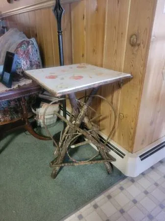 For sale is a very well and artistically made, antique Adirondack bent twig side table with a hand painted canvas top. I see others that are similar that are attributed to the early 1900 s. Asking $550.00. 208-659-2223