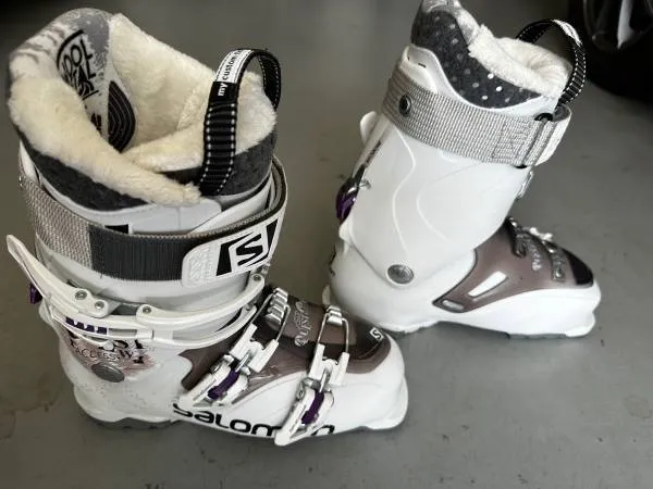 Brand New Never Worn. SALOMON Quest access 25.5 Boot.. Fits appx 8.5 to 9. Get your downhill skiing career off to the right start in the Salomon QST Access 60 W Ski Boots. A womens liner with anatomic tongue guarantees all-day comfort, with a Woolmetal layer to keep your toes warm while you dial in your lefts and rights. The shell is durable and soft flexing, and the Hike and Ride walk mode makes visits to the lodge, the commute to and from the parking lot, as easy as pie. Make every day at the mountain a walk in the park with the Salomon QST Access 60 W Ski Boots. Product Details Last: 104 mm – A relaxed, comfort-focused last designed to accommodate wider and higher volume feet. Womens Cuff Design – Anatomic cuff with lower rear calf support for better fit and comfort. Flex: 60 – A soft flex designed for newer skiers. My Custom Fit Comfort Liner + Woolmetal – A Woolmetal layer inserted in the liner guarantees insulation for warm feet all day. Womens liner with an anatomic tongue made of highly moldable foams provides better shin and instep comfort in sensitive foot z 1 s. Shell – Polyolefin with Easy Step-In Overlap Cuff – Polyolefin Stance, Oversized Pivot – The riveted Oversized Pivot ensures perfect power transmission between cuff and shell. Ski/Walk Mode, Hike and Ride Walk Mode – A patented system combining the backb 1 release with a specific V-cut shape on the back of the lower shell. It allows for effortless walkability in hike mode, strong back support and progressive forward flex for skiing down. Buckles 3 Riveted Alumix Tool Free Tooth Adjustement – Easy tool-free personalization to the lower leg volume by rotating and moving the lower buckle. Power Strap, 36035 mm Strap Sole, Alpine ISO 5355 Soles Currently selling 266$ on sale + Tax. see last pic. Cash only will not deliver if add Is posted Boots ARE available. Call text 720-987-0720.