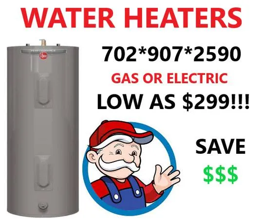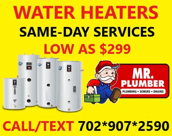 Local Plumber: FREE CONSULTATION! Same-Day Services! 24/7 CALL Toll-Free 1-877-OMG-LEAK 664-5325 Call/TEXT Local #: 702-907-2590 Dont want to pay Thousands to replace your Water Heater??? I do not make $$$$ on the water heater or parts you get it all at COST! Water Heaters only cost: *40 Gallon Water Heaters are only $499 NEW *50 Gallon Water heaters are only $599 NEW Rates for Service: $299 Flat Rate: You already have the water heater and needed supplies at the location and need some 1 to install and dispose of your old unit. Any *40/50 Gallon first-floor unit. Send pics. $349 Full-Service: I will help you get the correct water heater unit from Home Depot or Lowes and pick up, install, and dispose of your old water heater unit. First floor rate. Send Pics. *Out-of-state property owners welcome. *75 Gallon Units inquire. CALL Toll-Free 1-877-OMG-LEAK 664-5325 Call/TEXT Local #: 702-907-2590 *Other Plumbing Services offered. Toilets, Faucets, Sinks, Pipe Repair, Hose Bibs, ANY Plumbing. *Keywords: Plumbing, Plumber, water heater, water heaters, faucet, kitchen, bathroom, leak, fix, repair, pipe, slab, service, hook up, hose bib, hose, garbage disposal, Disclaimer: Under NRS 620.7202 I am not a licensed contractor/plumber. I assist homeowners/property owners under NRS 624.0318 and/or provide Labor services only. I do not work for Home Warranty or Property Management Companies.