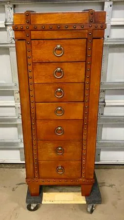 Elegant Jewelry Cabinet/Chest. 7 spacious pull out drawers; 2 with divided compartments. Jewelry hooks within each side door. Hinged lid with a mirror. Lovely cherry finish and stunning antique bronze hardware with studs. Like new condition. Measures: 17 wide x 391/2 tall x 12 deep. If interested please text or call 816-255-5578. Cash only. North Naples-2 miles East of I-75 and Immokalee, turn right into Ibis Cove.816-255-5578. Thank you for looking!