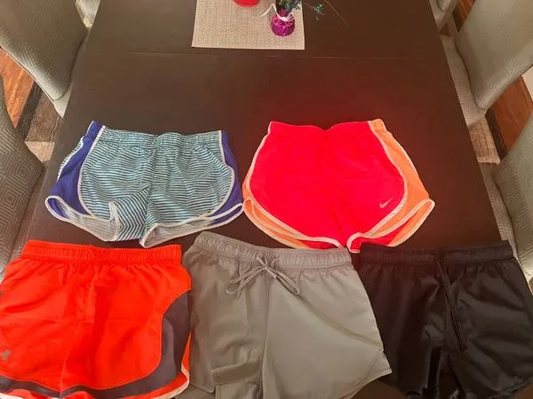 I have 5 different shorts in great condition 1 Nike and 1 under Armor and the other 3 are from Kohls. 1 of the orange shorts has a small scruff mark. See photo. If interested, please/call text me at 408-431-0400.