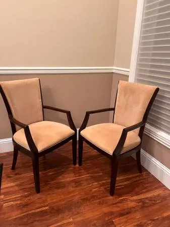 I purchased a formal dining room table with 6 chairs for approximately $4500 at Z Gallery. I also spent another $800 on the custom fit for the 6 suede chair covers. It has been kept in meticulous condition. I am selling my 2 arm chairs since we are now using only 4 chairs and do not have space for the remainder. Asking for $250 for both arm chairs with the custom suede chair covers or make your best offer. Call/text me at 408-431-0400.