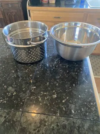 Large stock pot type pan andLarge strainer pot/colander pot for large stock pot or canner, they are not matching but they work both together. Both are between 9 and 10 quart size. $10 each or both for 15. 509-951-1571.
