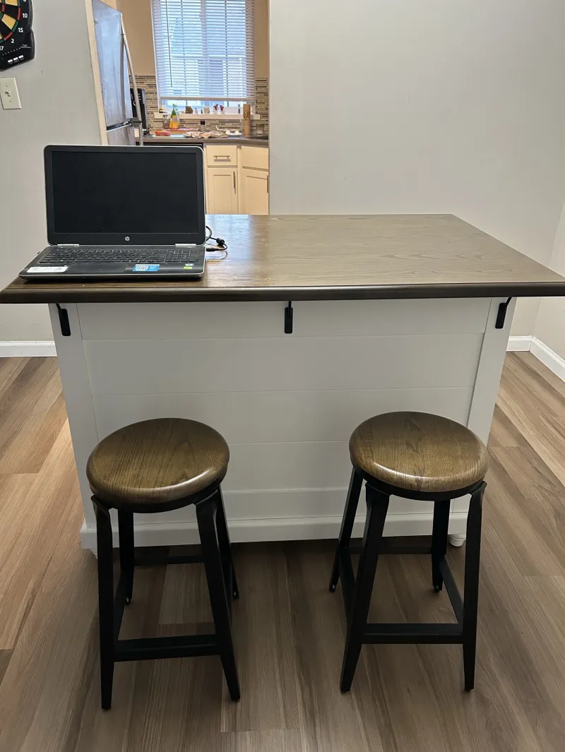 47 3/4” x 31”. Sturdy. two drawers, one cabinet and shelf. Holds case of water. Two sturdy round seat metal leg stools.