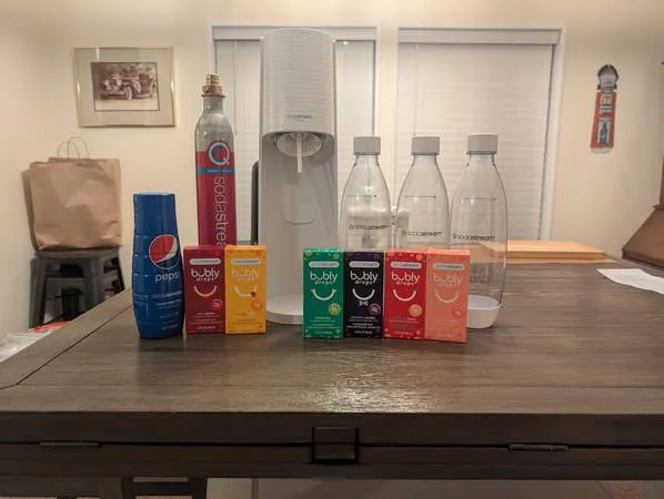 WHITE SODA STREAM TERRA INCLUDES 3 - 1 LITER CLEAR BOTTLES, SLIGHTLY USED CO 2 TANK INCLUDED, UNOPENED PEPSI SYRUP, 6 UNOPENED BUBLY DROPS - FLAVORS ARE LIME, CHERRY, BLACKBERRY, MANGO, STRAWBERRY & GRAPEFRUIT. $40.00 FOR EVERYTHING 405-413-8671