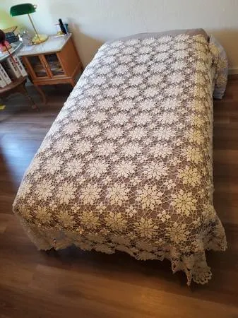 BEAUTIFUL ANTIQUE HAND CROCHETED BEDSPREAD IVORY COLOR, OPEN TO ANY COLOR UNDER CLOTH LIFE WELL LIVED IN LANE CEDAR CHEST, WRAPPED IN ACID FREE PAPER PICTURES DO NOT SHOW TRUE COLOR APPROXIMATE 76 x 74 WILL GO LONGER AND WIDER IF YOU OPEN IT OUT MORE 14 ROWS TOP TO BOTTOM, 13 ROWS ACROSS 405-413-8671