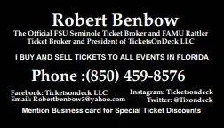 BUYING AND SELLING FSU FOOTBALL CLUB TICKETS. IF YOU NEED TICKETS OR HAVE EXTRAS CALL OR TXT 850-459-8576. I ACCEPT ALL MAJOR CREDIT AND DEBIT CARDS PAYPAL SQUARE CASH APP VENMO Facebook AND GOOGLE WALLET PAYMENTS. DELIVERY AND WILL CALL ALSO AVAILABLE. IF U NEED TICKETS AND WANT TO SAVE M 1 Y CALL OR TXT 850-459-8576