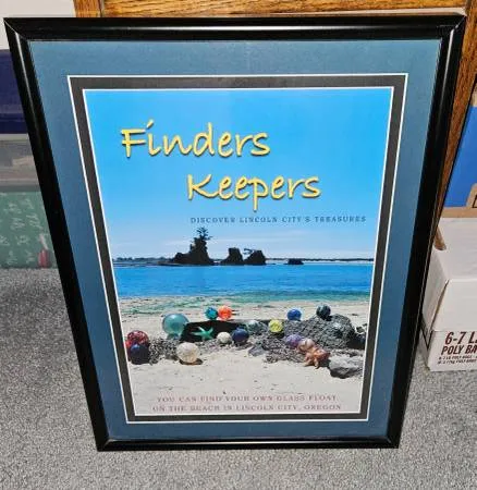 6 This custom framed, double matted, art print is from 1 of the first Finders Keepers seasons and is titled, Discover Lincoln Citys Treasures. It is 16 x 13.25 in size, Each year, Lincoln City, OR has a Finders Keepers promotion in which they hide hand blown glass floats, made by various glass artists, on local beaches for visitors to find. This is the ar 2 rk used to promote the event in during 1 of the early years. Cash only. You need to pick it up. No shipping.driveway, instead of front door, pick up See my other listings for other Finders Keepers framed Art If you are interested in buying it, TEXT ONLY your first name and what the item is you are interested in. I dont reply to messages that dont have this info due to Phishing and Spam mail. Thanks. 509-521-6543