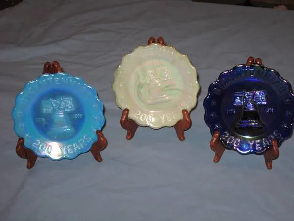 3 St. Clair Bicentennial Dishes... $10.00 each 1 Cobalt..... 1 Light Blue Opalescent..... 1 White Opalescent 51/2 dia. Thanks for looking Due to SPAM.... NO email or text.......... CALLS ONLY...419-472-8889