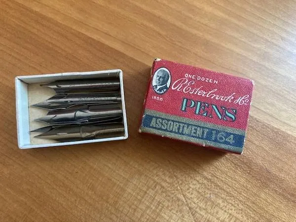 The first steel pens manufactured in America were made by Richard Esterbrook in 1858. So says the vintage box of this 1940 s-era Assortment 164 R. Esterbrook Co. pens with 7 nibs remaining of the original dozen. Cardboard box measures approx 2 x 1.25 by 1/2 see 4 th picand is in excellent vintage condition with only minor scuffs. Nibs are authentic new old stock and in perfect condition. No rust or other flaws. $10. CALLS ONLY please to 503-358-6383. No texts. No email. Fr...