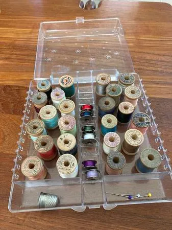 MCM Traum Thirty 6 er acrylic thread caddy decorated with atomic-era starbursts. Holds 24 spools and 12 bobbins, plus 2 compartments marked thimbles etc and pins, buttons. About 7.5 by 8.5 and 2 tall. Shows light wear for its 50 years but overall in very good, clean vintage condition. No cracks or other damage, and hinges and latch work perfectly. Note: Spools, bobbins and other sewing notions in pics are not included. $15. CALLS ONLY please to 503-358-6383. No texts....
