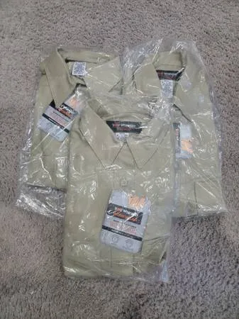 3 NEW Wrangler Womens Workwear Canvas Work Tan Shirts. Size Medium. Call 612-735-8444.