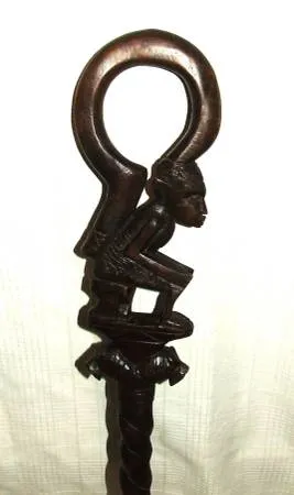 African Folk Art Hand Carved Twisted Dense Wooden Walking Stick This vintage Walking Stick depicts an African sitting atop of 2 unknown animals. There are a few nicks and abrasions, but it is still in good condition and will make a great addition to your collection and decor. The stick is 361/4 long, with a 11/4 diameter twisted shaft and a 43/4 wide looped handle. I have many other collectible, useful, and gift items available, just put y 2525 in the search box to view them. Many items can be shipped with payment made through paypal.Verified Member Easy pickup at my downtown Naperville home, 5 minutes from I 88. Any questions, Call Glenn at 630-989-1964.