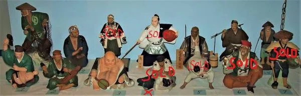 Vintage Japanese Hakata Urasaki Doll Collection Group 1 Samurai Fisherman Hotie & More Hakata Urasaki figurines are an ancient art form created in 1601. These incredibly detailed hand made clay figurines from the 1950 s depict every phase of Japanese Life, Folklore & Occupation. Each figurine is individaully priced as follows: Please note: this is the 1 st group of figurines, I have another group listed as well. Most of these are in good to excellent condition, any with damage will be noted. Vintage Japanese Hakata Urasaki Doll Collection Group 1 1 Man Carving Buddha Doll Figurine. Dimensions 8 x 7 x 10 H. EC $50610 2 Man carving a goddess figurine, goddess head & pinky finger repaired. Dimensions 8.5 x 6 x 7.5 H. $30 no label 3 Buddha Figurine Hotei 1 of the 7 gods of good luck / Original Card. Dimensions 10.5 x 7 x 7 H EC $100 #U-181 4 Sold 5 sold 6 sold 7 sold 8 Fisherman Casting a Net - Large - Impressive / Original Card. Dimensions 10 x 7.5 x 15 H EC $150 9 Man Making a Fishing Net, dimensions 6 x 9.5 x 9.5 H. EC $50 10 sold 11 sold 12 Samurai Kneeling / Wooden Plaque reads Satokai Samurai in Japanese, Dimensions 7.5 x 6 x 9.5 H. EC $75 No label 13 Man Carrying Water Buckets / Shoulder Pole, Dimensions 11 x 4 x 11.5 H. EC $50 14 Fisherman / Bamboo Pole, paint nick on back side, arm has been repaired. Dimensions 5 x 4 x 11.5 H. $30162 I have many other collectible, useful, and gift items available, just put y 2525 in the search box to view them. Many items can be shipped with payment made through paypal.Verified Member Easy pickup at my downtown Naperville home, 5 minutes from I 88. Any questions, Call Glenn at 630-989-1964.