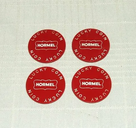 Hormel Lucky Coin ~ Vintage Plastic Token ~ Lot Of 4 ~ New Old Stock These Lucky Coins have been sitting in a box for decades, they may have some wear, but they are in good condition and will be a great addition to your collection ~ share them with Friends and Family as well. The coins resemble a poker chip with dimensions of 11/2 in diameter x 3/16 thick. The white lettering is stamped into the plastic, 1 side reads: Famous Foods of The world by Hormel Kottbullar Beef Stroganoff Chicken Cacciatore Garbanzo Soup Onion Soup. The other side reads: Hormel Lucky Coin Lucky Coin. These coins are new old stock probably dating to the 60 s, a small supply was discovered at an estate of a former Hormel sales rep. I have many other collectible, useful, and gift items available, just put y 2525 in the search box to view them. Many items can be shipped with payment made through paypal.Verified Member Easy pickup at my downtown Naperville home, 5 minutes from I 88. Any questions, Call Glenn at 630-989-1964.