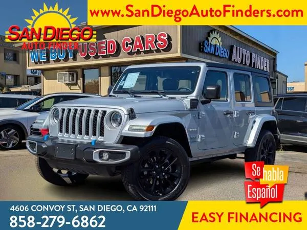 San Diego Auto Finders Ask for: Sales 858-279-6862 4606 Convoy Street San Diego, CA 92111 San Diego Auto Finders 4606 Convoy Street San Diego, CA 92111 Ask for: Sales main:858-279-6862 2023 Jeep Wrangler Just Awesome, Loaded, 8582796862 SUV Price: $27,999.00 Options: Black 3-Piece Hard Top Black Premium Mckinley Trimmed Seats Engine: 2.0 L I 4 Dohc Di Turbo Phev Front License Plate Bracket Quick Order Package 29 P Sahara Silver Zynith Clearcoat Transmission: 8-Speed Auto 8 P 75 ph Phev Basic Information: Stock Number: 26179 VIN Number: 1 C 4 JJXP 68 PW 641358 Make: Jeep Model: Wrangler Model Year: 2023 Type: SUV Vehicle Trim: Just Awesome, Loaded, 8582796862 Interior Color: Black Exterior Color: Silver Zynith Clearcoat Body Type: SUV Engine: MPG Automatic City: 52 MPG Automatic Highway: 45 Engine Description: 2.0 L 4 Cylinders Fuel Type: Other Fuel Induction: DI Valves Per Cylinder: 4 Aspiration: Turbocharged DriveTrain: 4 WD Type: Part Time W/ On Demand Setting Transmission: Automatic Wheels Rims: Painted Aluminum Alloy Wheels Spare Rim Type: Aluminum Alloy Drive Train Type: 4 Wheel Drive Suspension: Stabilizer Bar: Front And Rear Instrumentation: Clock Compass External Temp Low Fuel Level Tachometer Roof and Glass: Front Wipers: Variable Intermittent Privacy Glass In Car Entertainment: Antenna Type: Diversity, Mast Audio System: AM/FM, HD Radio, Voice Operated, Touch Screen Display Premium Brand: Alpine Speakers: 8 Seats: Drivers H 8: Manual Drivers Lumbar: Manual Seating Capacity: 5 Front Seat Type: Bucket Upholstery: Leather-Trimmed Folding: Split Convenience: Center Console: Front Console With Armrest And Storage, Illuminated, Locking Cruise Control Cupholders: Front, Illuminated, Rear Power Outlets: 12 V Cargo Area, 12 V Rear, 115 V Rear, 12 V Front, USB Front, USB-C Front, USB-C Rear Seatback Storage Steering Adjustment: Tilt And Telescopic Steering Power: Variable/Speed-Proportional Steering Wheel Control: Audio, Cruise Control, phone, Multi-Function, Voice Control Universal Remote Transmitter: Home - Garage Door Opener Auto Dimming Mirrors Power Mirrors Power Door Locks: Anti-Lockout, Auto-Locking Windows: Power Windows Navigation System: Hard Drive, Touch Screen Display, Voice Operated Comfort: Air Conditioning: Automatic Climate Control Air Filtration Trunk Lights Mats: Rear, Front Reading Lights: Front, Rear Shift Knob: Leather Steering Wheel Trim: Leather Vanity Mirrors: Dual Illuminating Safety: NHTSA Passenger Grade: Excellent NHTSA Driver Grade: Good NHTSA Roll Over Resistance Rating: Average ABS: 4-Wheel Anti Theft System: Alarm, Vehicle Immobilizer Brake Assist Safety Locks Daytime Running Light: LED Fog Lights: LED Headlights Auto Delay Front Headrests: 2, Adjustable Rear Headrests: 3, Foldable Safety Stability Control Driver and Passenger Airbag Side Airbag Stability Control Dimensions: Front Hip Room: 53.9 Inches Front Shoulder Room: 55.8 Inches Front Leg Room: 40.8 Inches Rear Hip Room: 55.9 Inches Rear Leg Room: 38.2 Inches Rear Shoulder Room: 55.8 Inches Luggage Capacity: 27.7 Cu.Ft. Maximum Seating: 5 Length: 188.4 Inches Width: 73.9 Inches H 8: 73.5 Inches Wheelbase: 118.4 Inches Ground Clearance: 10.1 Inches Max Gross Vehicle W 8: 6200 Lbs. Curb W 8: 5100 Lbs. Enter this to see more images plus all other inventory we have available: http://lyv.cc/9 U 4 N 5 Description: Tuned for the trail, our electrified 2023 Jeep Wrangler 4 xe Sahara 4 X 4 looks terrific in Silver Zynith! Motivated by a TurboCharged 2.0 Liter 4 Cylinder and 2 Electric Motors providing a combined 375 hp to an 8 Speed Automatic transmission. The incredibly capable 4 Wheel Drive SUV just about does it all with Dana axles, an EV range of nearly 22 miles, and a gas-hybrid mode that sees nearly 20 mpg combined. Iconic Jeep styling gives our Wrangler 4 xe a bold presence backed by exclusive Sahara graphics, LED lighting, fog lamps, blue tow hooks, 20-inch alloy wheels, full-body fender flares, side steps, rugged skid plates, and a removable top and doors. Our Sahara cabin encourages inspiring adventures with comfortable McKinley cloth seats, a premium wrapped steering wheel, automatic climate control, cruise control, and keyless access/ignition. First-class technologies include a Uconnect infotainment system with a 7-inch driver display, a 7-inch touchscreen, Navigation, voice command, Apple CarPlay/Android Auto, Bluetooth, Off-Road Info Pages, and an Alpine sound system. Jeeps dedication to safer driving shines through with a rearview camera, ABS, stability/traction control, hill-start assist, tire-pressure monitoring, advanced airbags, trailer sway damping, and more. Our Wrangler 4 xe Sahara is the plug-in hybrid thats pure Jeep! Save this Page and Call for Availability. We Know You Will Enjoy Your Test Drive Towards Ownership! A 27 FBAFAEA 464 DBBB 650 D 168074 EE 06 C 4085946911962448 Jeep Wrangler Just Awesome, Loaded, 8582796862 Jeep Wrangler Just Awesome, Loaded, 8582796862
