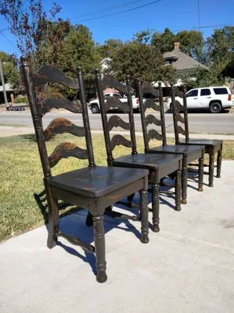 Set of 4 ash black distressed ladder back dining chairs, excellent condition,heavy, sturdy,18 w,/16.5 d/17.5 seat h/41 back h pick up 752462146824794, Scam can order pizza at 214-828-9090